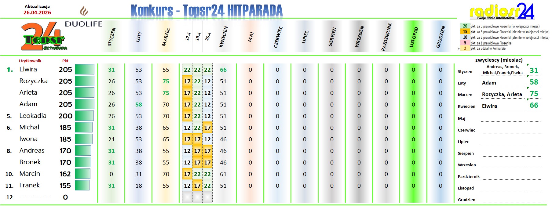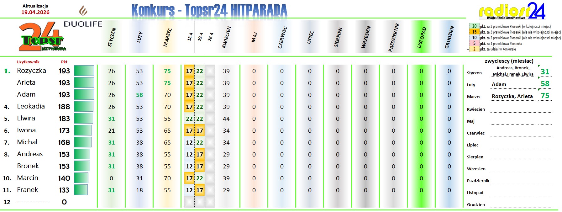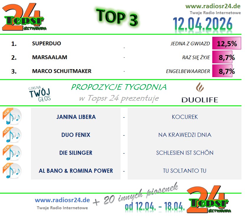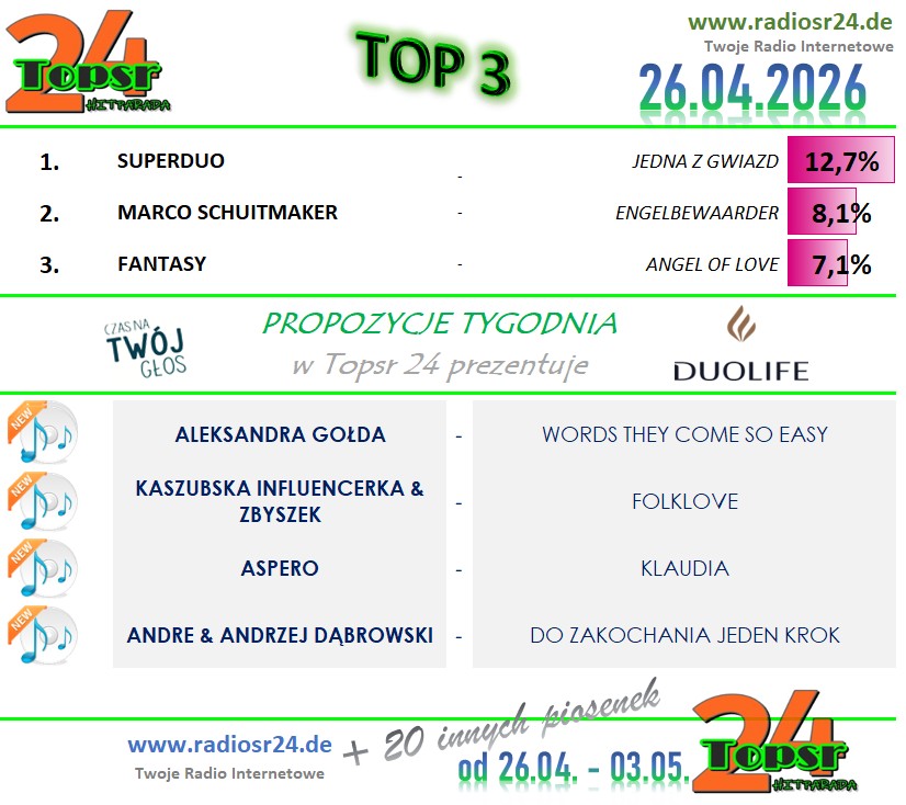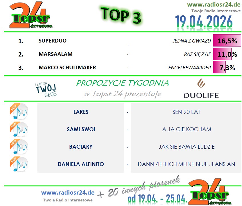 Zapraszamy Jak W Ubieglym Roku Na Kolejny Konkurs W Hitparadzie Radia radiosr24.de. W Kazda Niedziele Od Godz.: 12:00 Typujemy Pierwsza Trojke Aktualnego Notowania. Za Prawidlowe Typy Otrzymasz Pkt. (wiecej Info w grafice). Kazdy Uczestnik Z Najwieksza Punktakcja W Aktualnym Miesiacu Otrzymuje Nagrode Na Koniec Miesiaca. A Na Koniec Roku Sa Juz Zaplanowane Nagrody Dla Uczestnika Z Najwieksza Punktacja .. Wiec Nie Odwlekaj I Dolacz Rowniez Tez.
