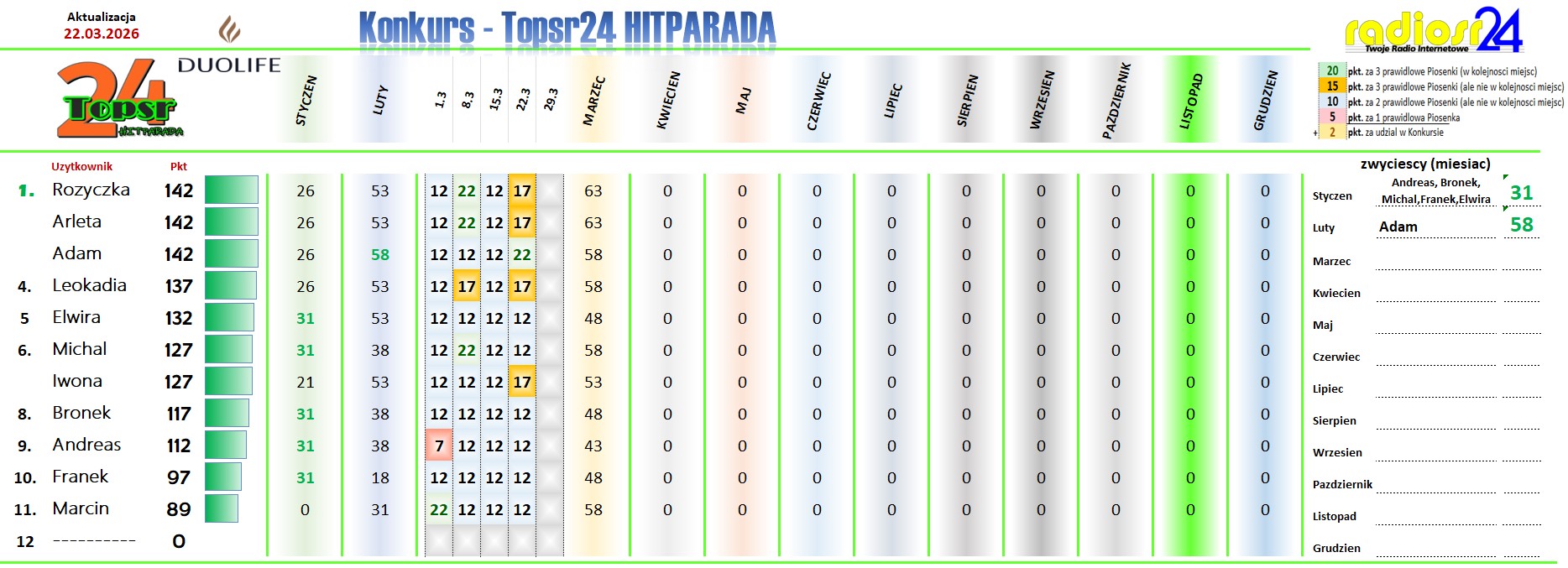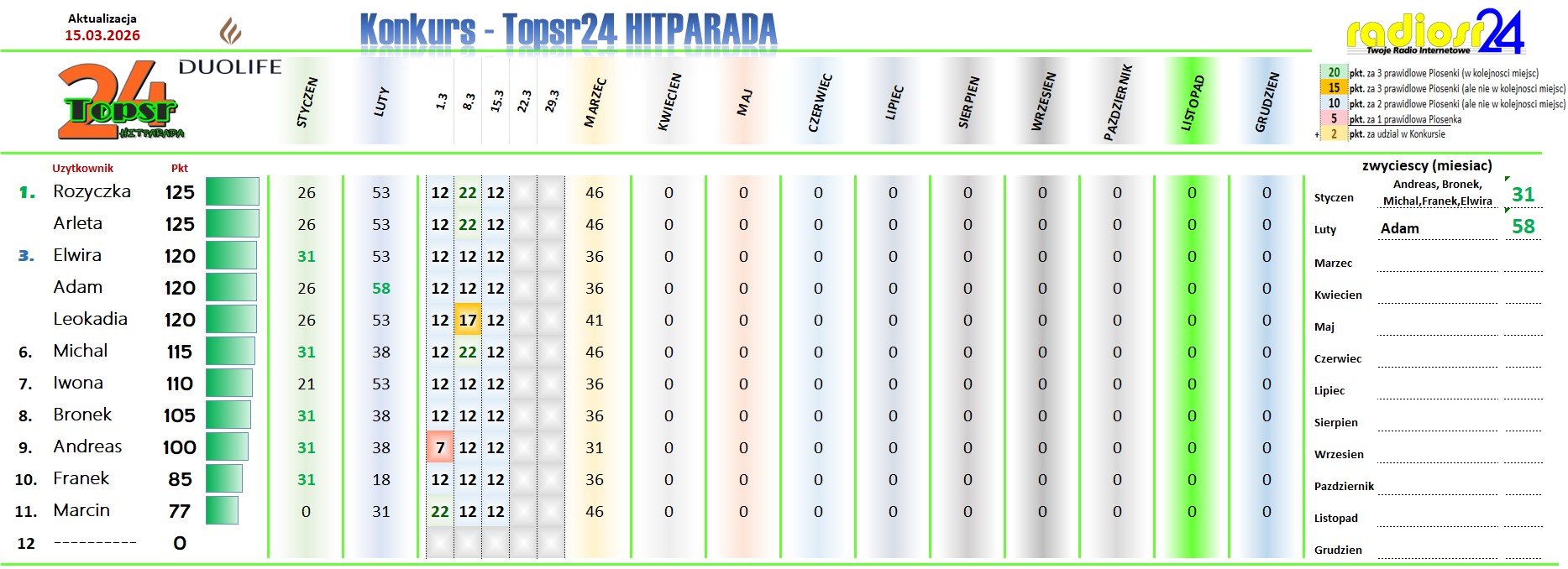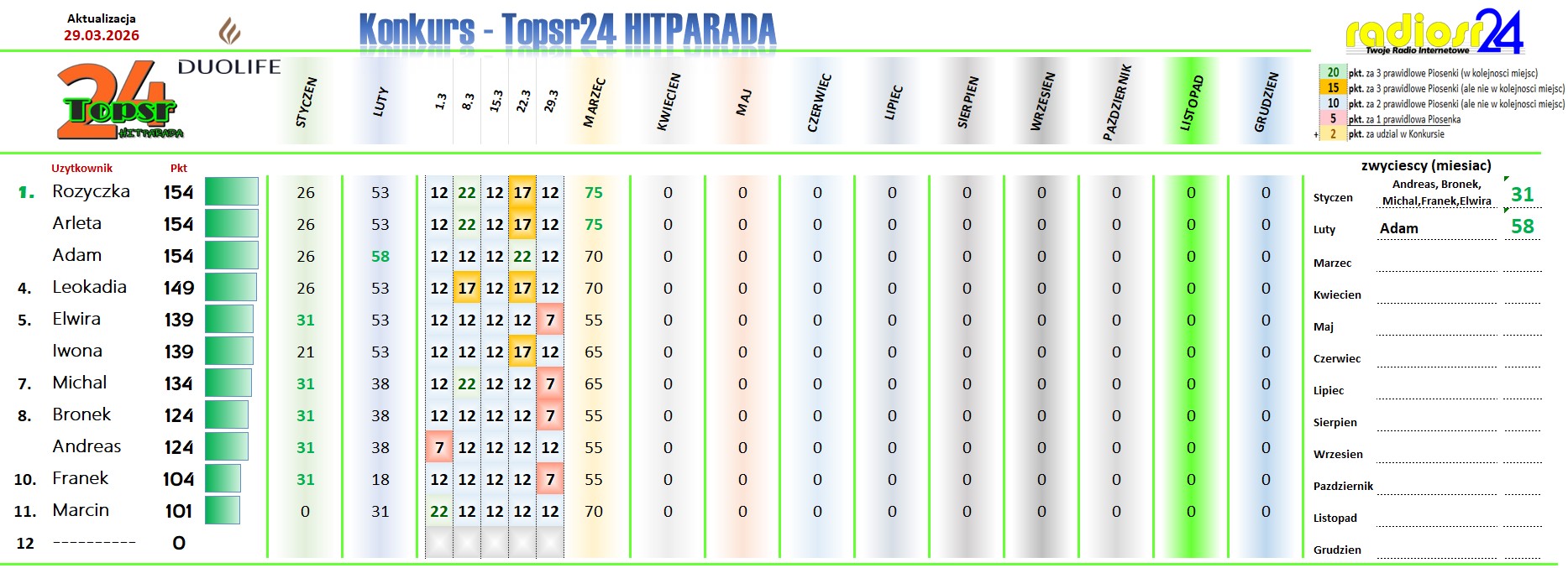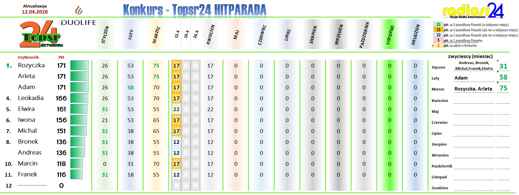 Zapraszamy Jak W Ubieglym Roku Na Kolejny Konkurs W Hitparadzie Radia radiosr24.de. W Kazda Niedziele Od Godz.: 12:00 Typujemy Pierwsza Trojke Aktualnego Notowania. Za Prawidlowe Typy Otrzymasz Pkt. (wiecej Info w grafice). Kazdy Uczestnik Z Najwieksza Punktakcja W Aktualnym Miesiacu Otrzymuje Nagrode Na Koniec Miesiaca. A Na Koniec Roku Sa Juz Zaplanowane Nagrody Dla Uczestnika Z Najwieksza Punktacja .. Wiec Nie Odwlekaj I Dolacz Rowniez Tez.