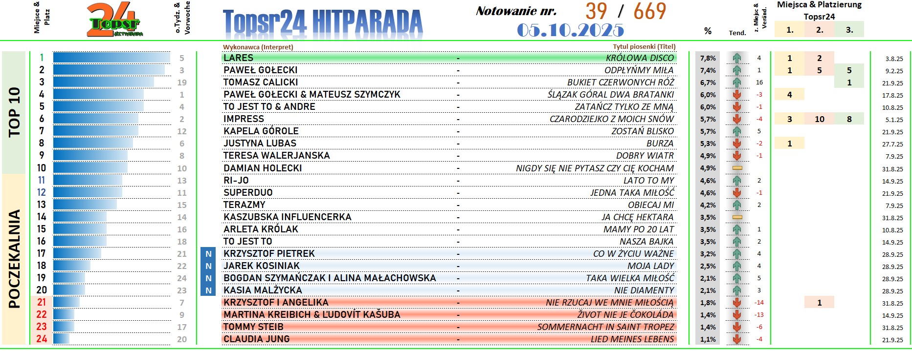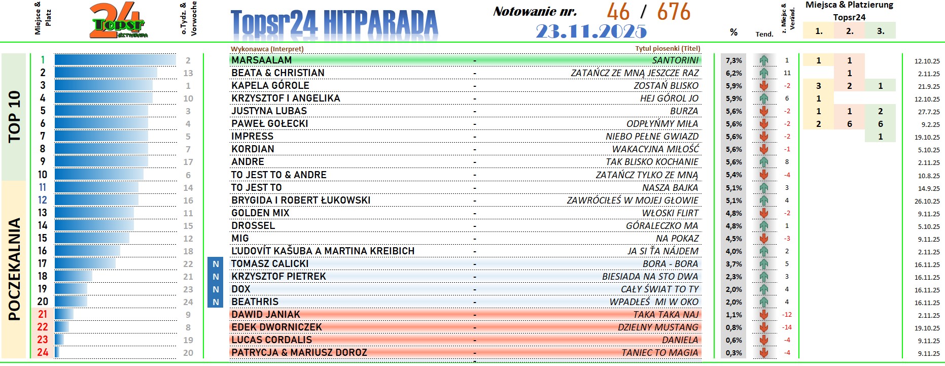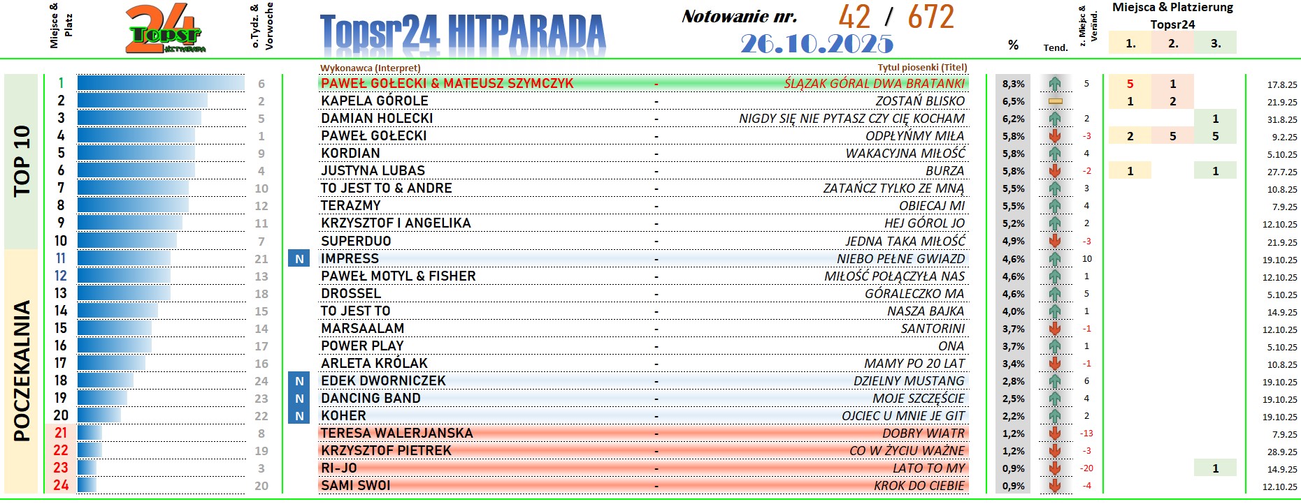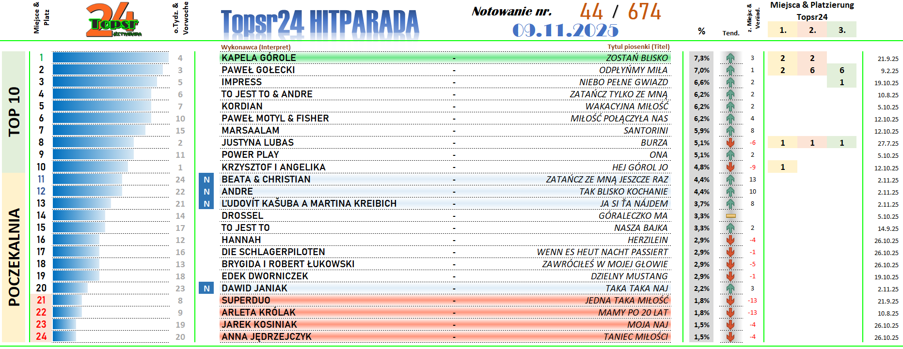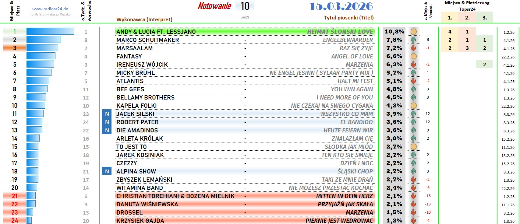 ARCHIWUM notowan Hitparady Topsr24 gdzie znajdziecie wszystkie notowania HITPARADY radia radiosr24.de od roku 2016 do dzis, oraz PIOSENKI ROKU 2011-2025.