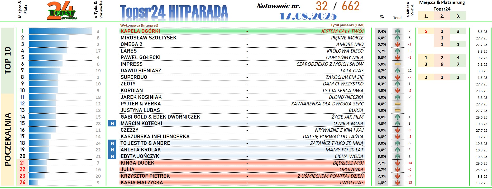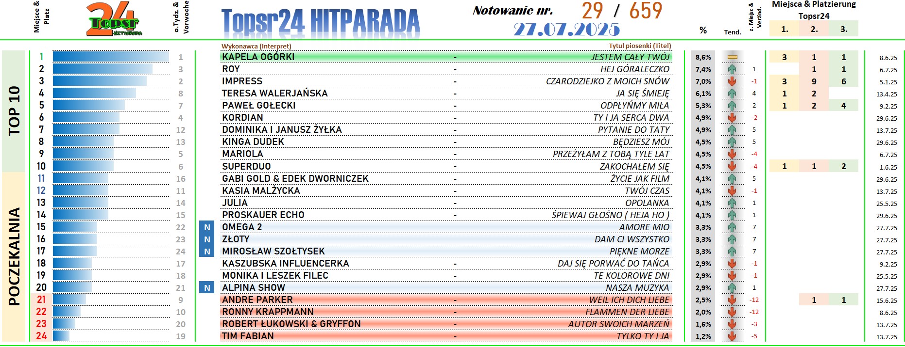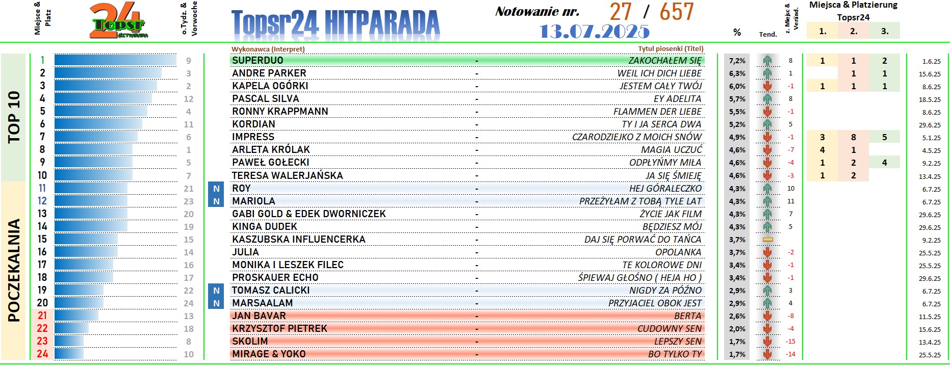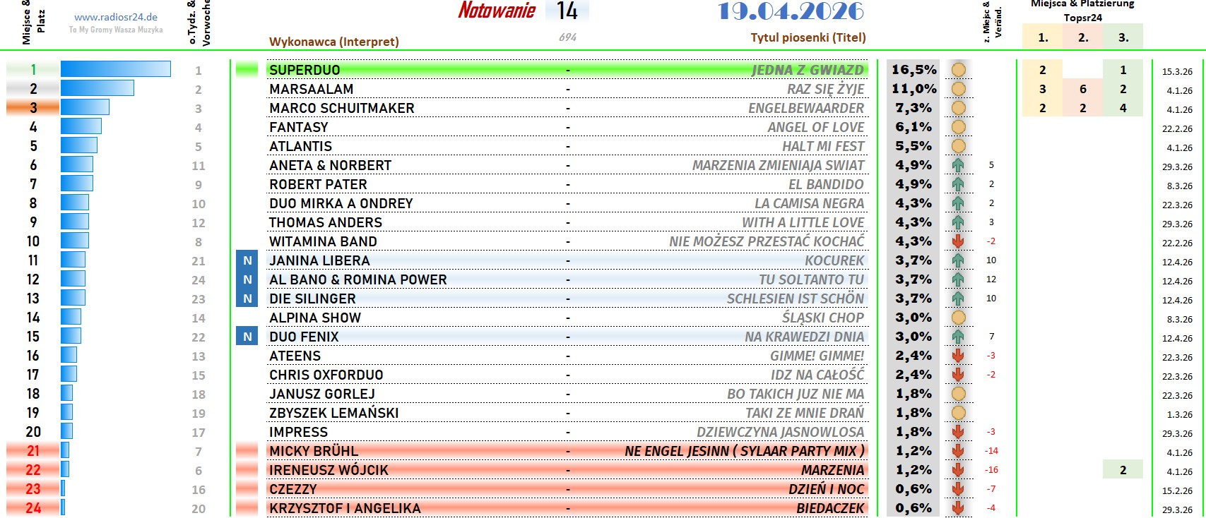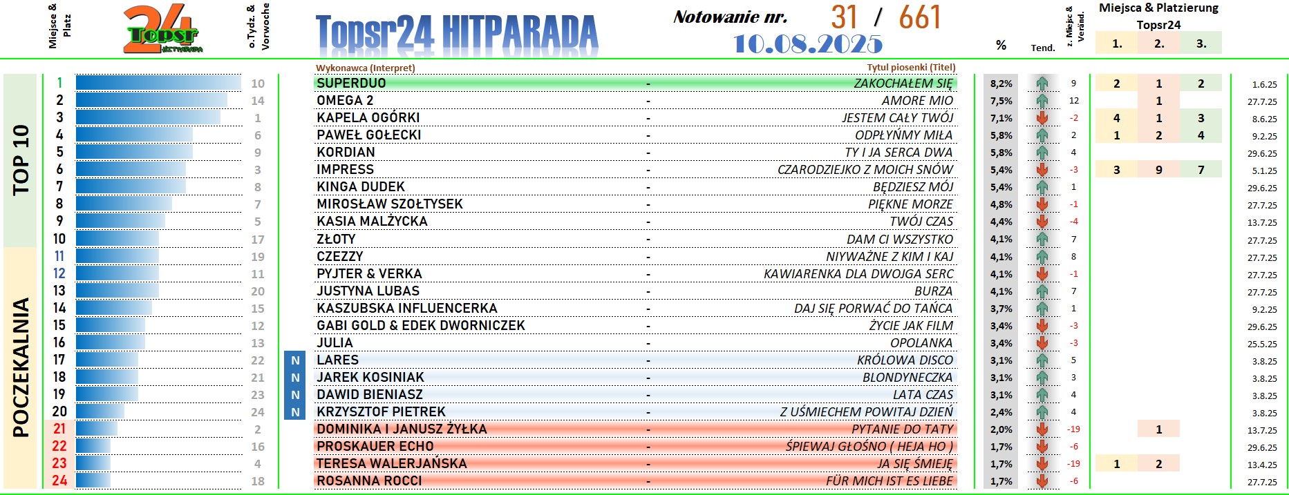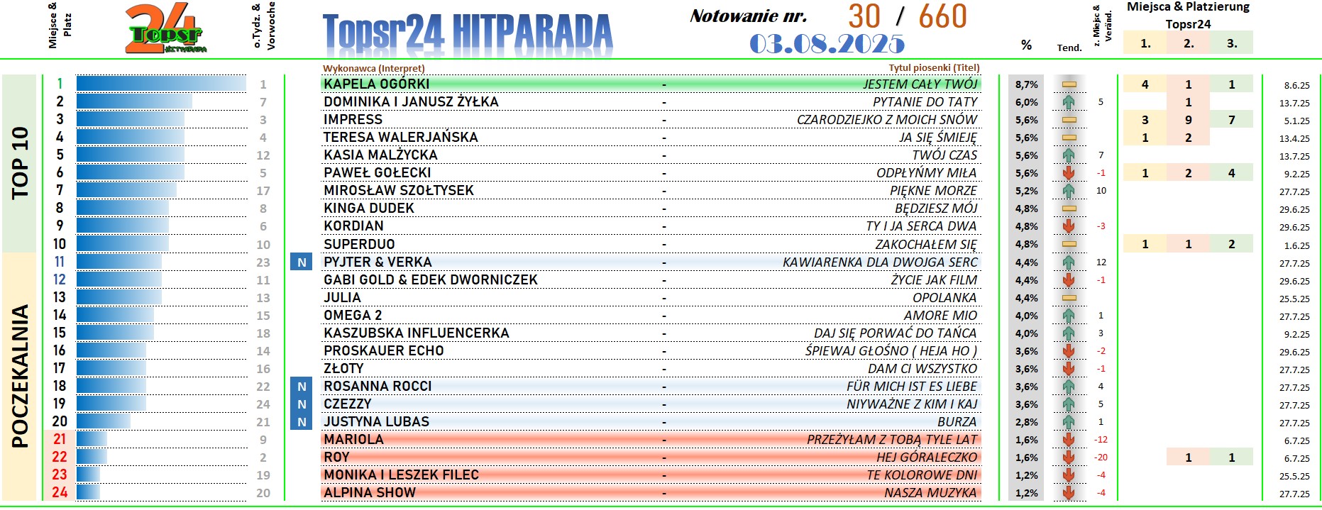 ARCHIWUM notowan Hitparady Topsr24 gdzie znajdziecie wszystkie notowania HITPARADY radia radiosr24.de od roku 2016 do dzis, oraz PIOSENKI ROKU 2011-2025.