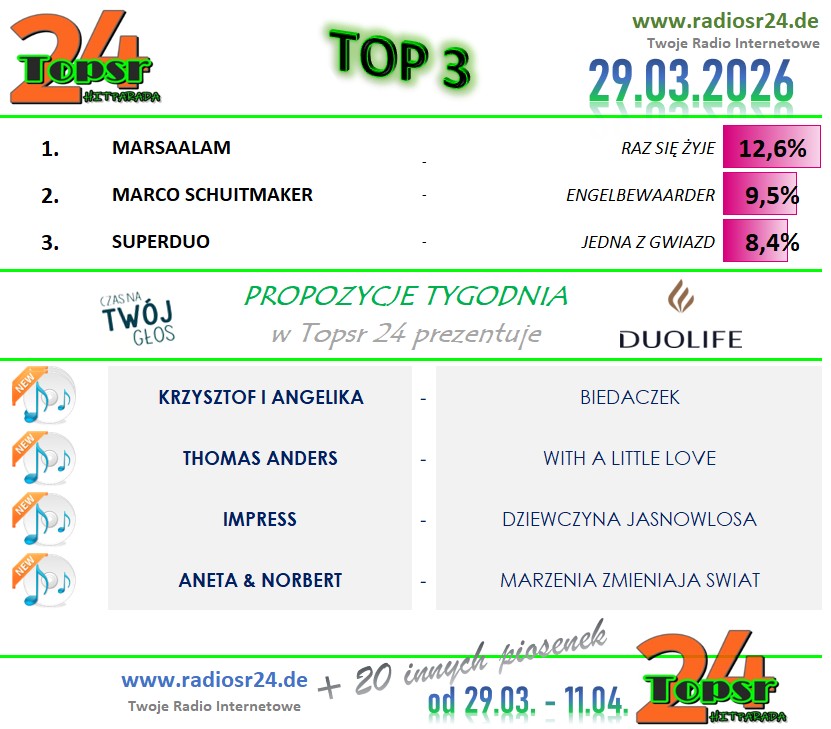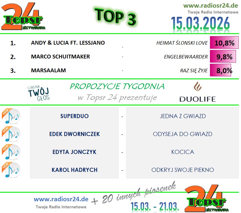 Zapraszamy Jak W Ubieglym Roku Na Kolejny Konkurs W Hitparadzie Radia radiosr24.de. W Kazda Niedziele Od Godz.: 12:00 Typujemy Pierwsza Trojke Aktualnego Notowania. Za Prawidlowe Typy Otrzymasz Pkt. (wiecej Info w grafice). Kazdy Uczestnik Z Najwieksza Punktakcja W Aktualnym Miesiacu Otrzymuje Nagrode Na Koniec Miesiaca. A Na Koniec Roku Sa Juz Zaplanowane Nagrody Dla Uczestnika Z Najwieksza Punktacja .. Wiec Nie Odwlekaj I Dolacz Rowniez Tez.
